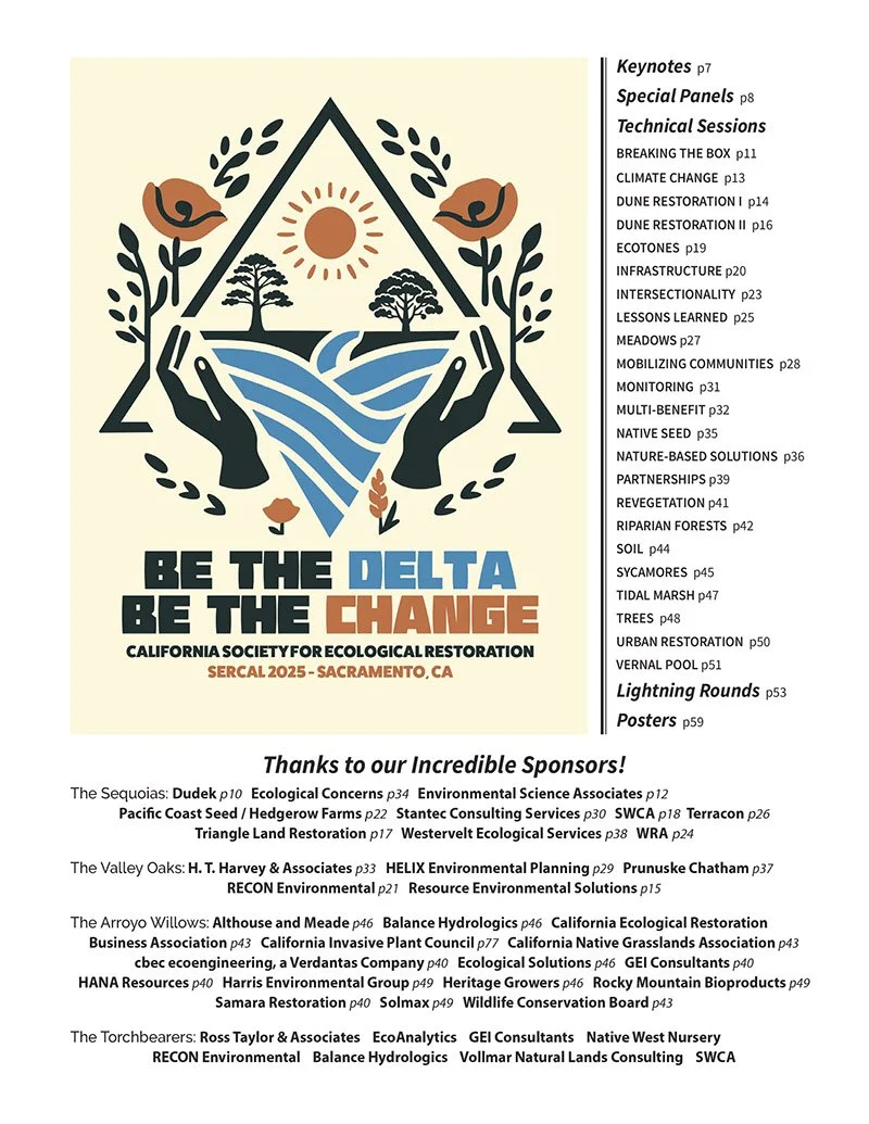 Since its founding 30+ years ago, the California Society for Ecological Restoration has been the key statewide organization in advancing the science, art, and practice of restoring California’s native and unique habitats. Most if not all of our work directly contributes to statewide goals, initiatives, and key programs — 30x30, Cutting the Green Tape, water and fire resilience, climate mitigation measures, key public and green infrastructure projects, environmental markets, ecological workforce growth, and public land management, as well as California Fish and Wildlife and State Water Board resource policies.